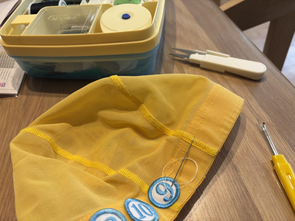 今日は子供のスイミング防止にバッヂを縫い付けました!